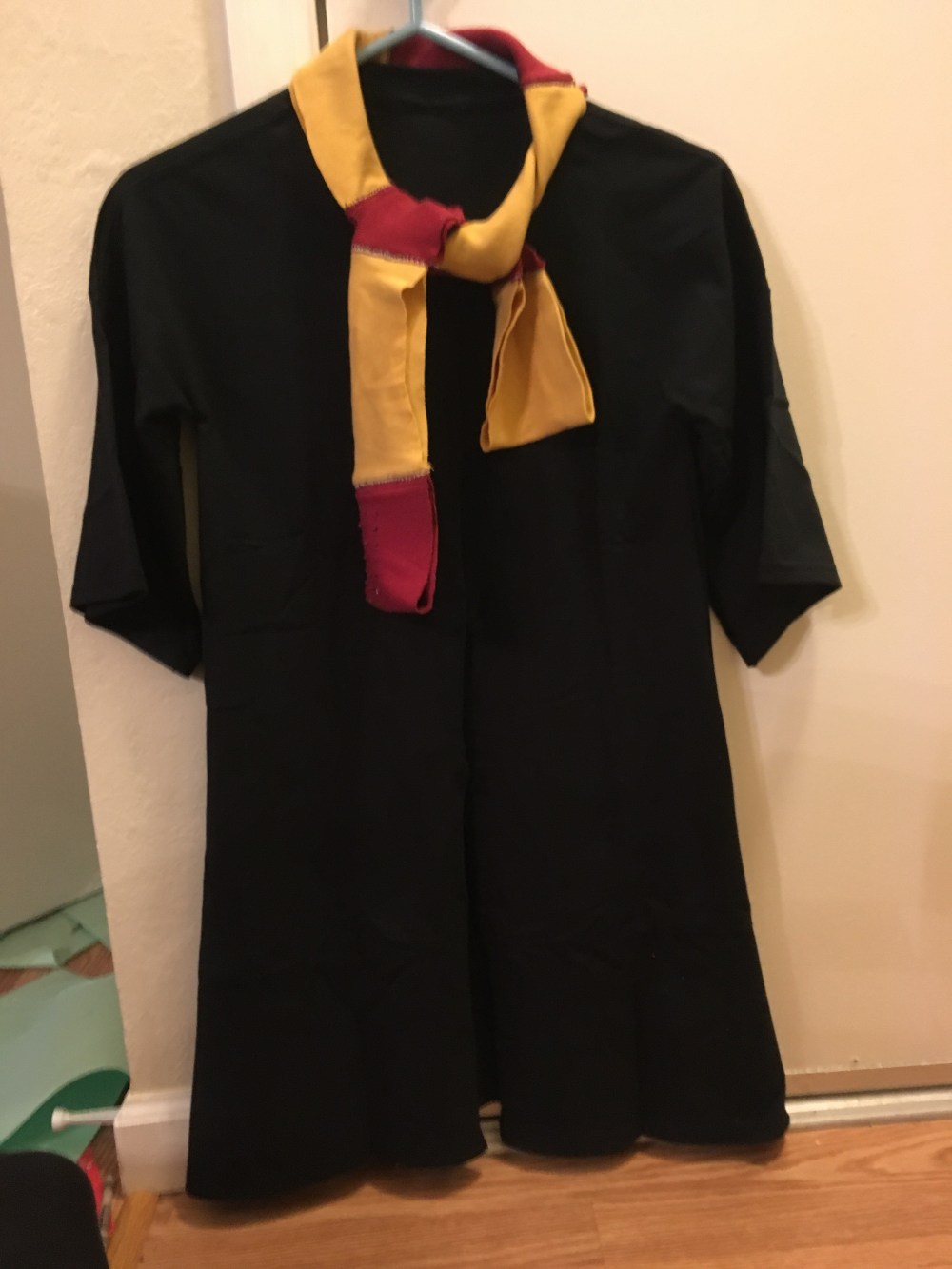 As it turns out, commercial Hogwarts gear costs money, which I don’t really keep around. And you can’t find plain back robes anymore (I swear, those were a Halloween staple when I was a kid). So we made the costumes. (Read: I made the costumes.)