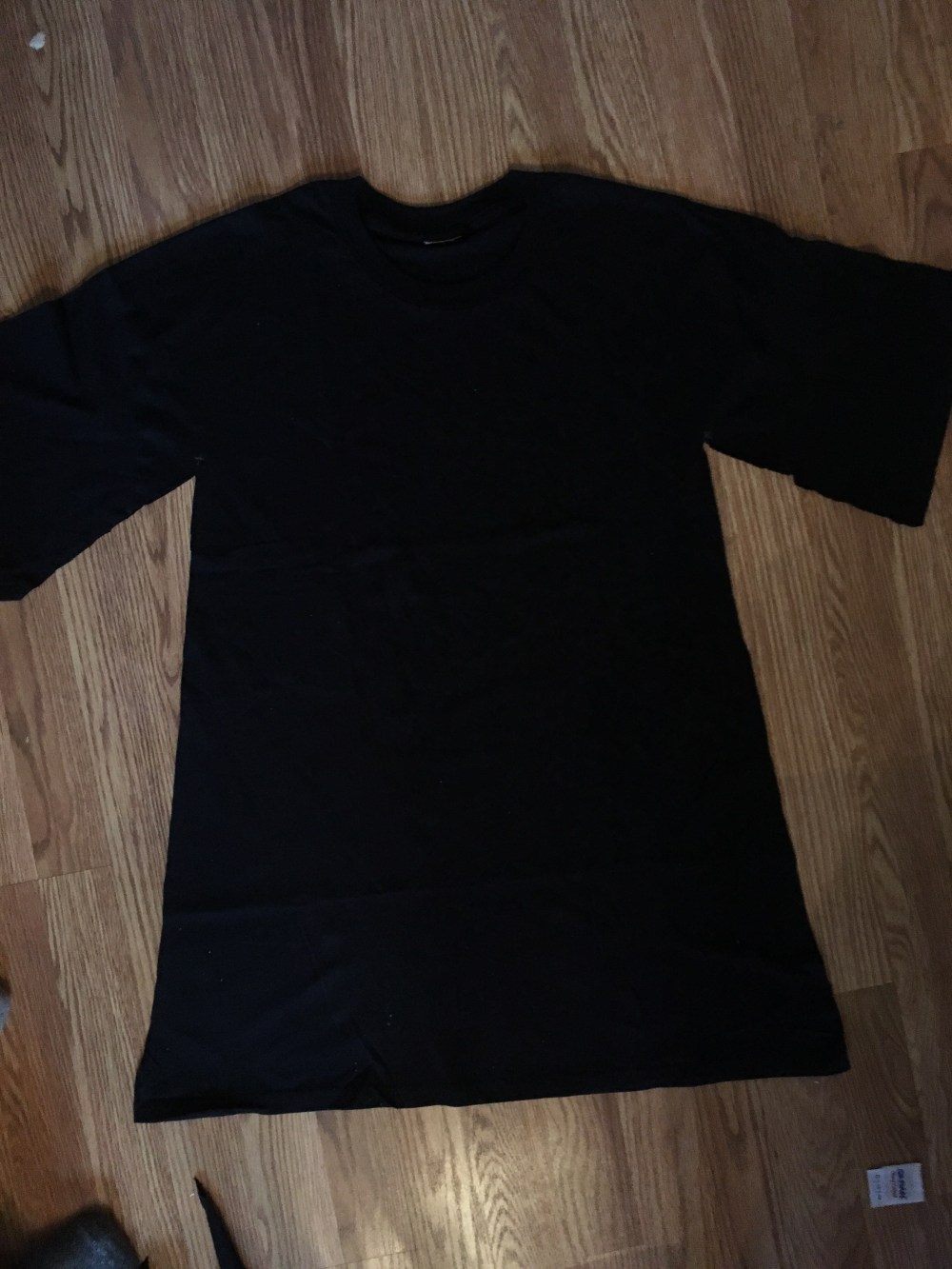 For my size 6-7 kids, I bought solid black XL men’s t-shirts. Lay the shirt out flat, and use a shirt that fits a little big on the kid as a pattern. Mark the t-shirt about an inch from the underarm seam.