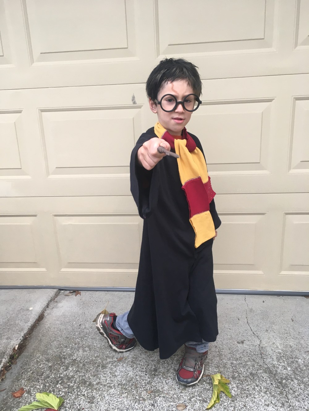 This year my oldest decided he was going to be Harry Potter. Easy, right? Scarf, robe, wand, scar and glasses.