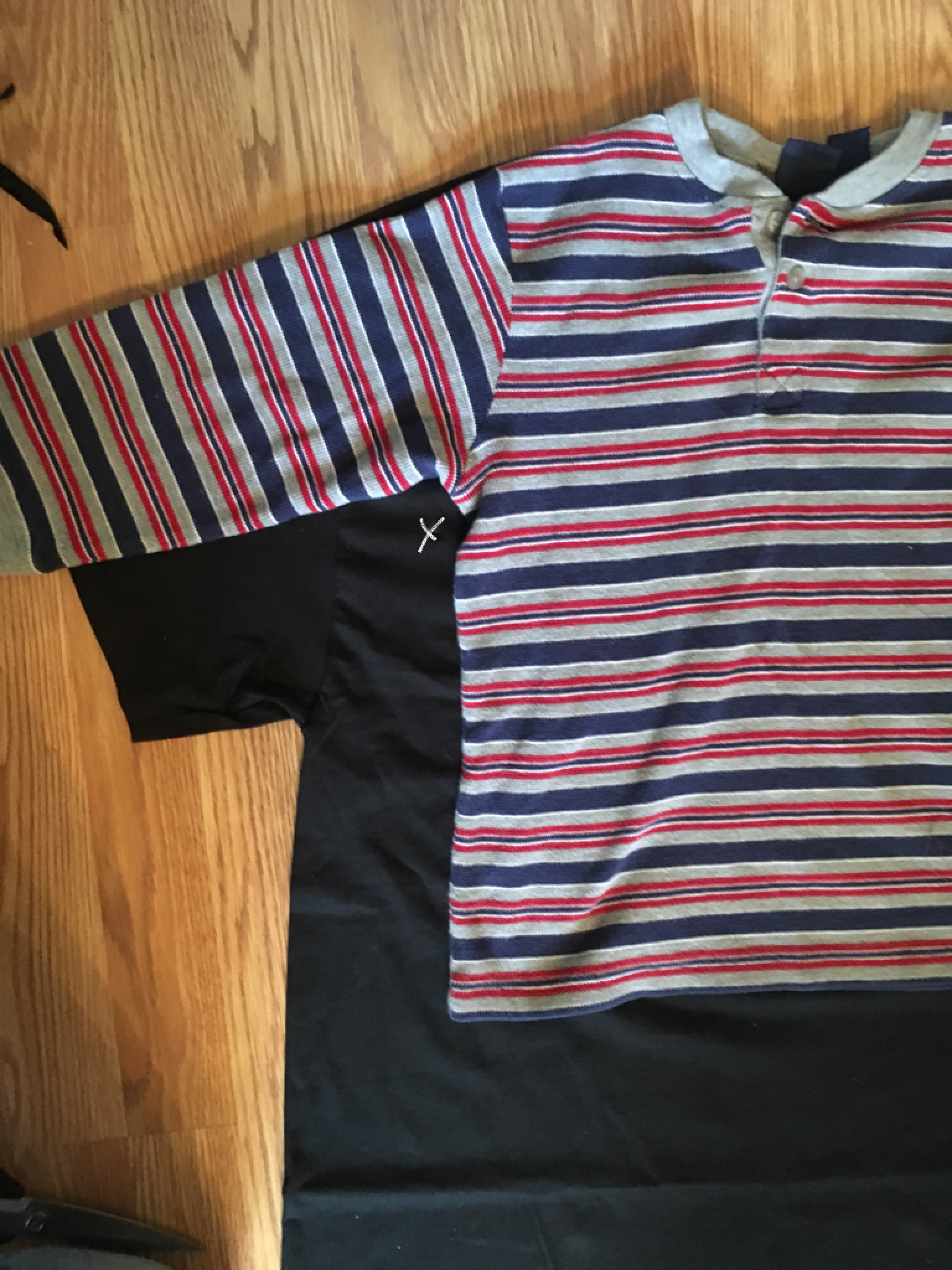 For my size 6-7 kids, I bought solid black XL men’s t-shirts. Lay the shirt out flat, and use a shirt that fits a little big on the kid as a pattern. Mark the t-shirt about an inch from the underarm seam.