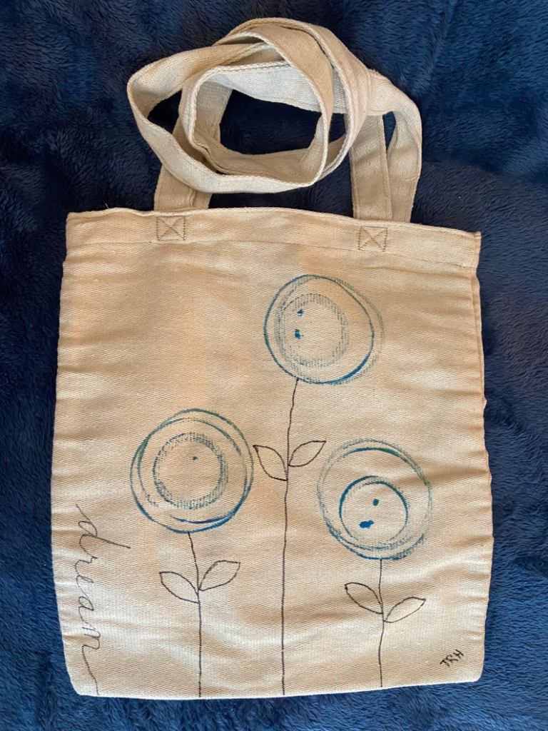 I painted this myself. I have several of these bags and find them incredibly useful for collecting rocks, hauling my hobbies to the playground to “watch” my kids, dragging sustenance on a picnic walk, and otherwise keeping all my paraphernalia accessible and NOT LOST as I wander vaguely about the world paying as little attention to my surroundings as possible.